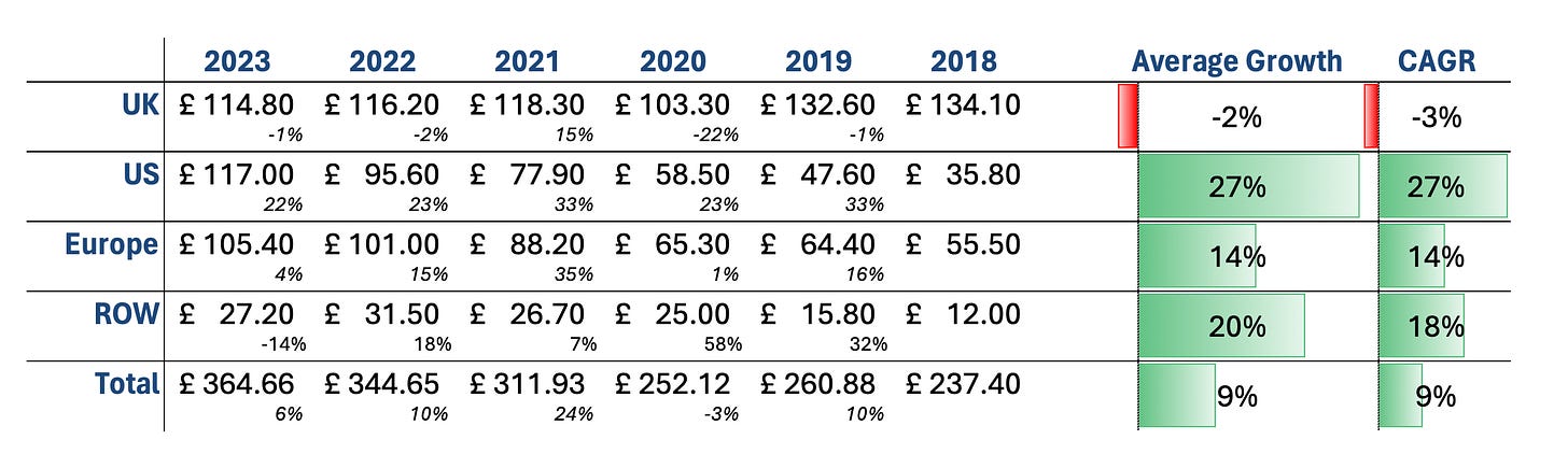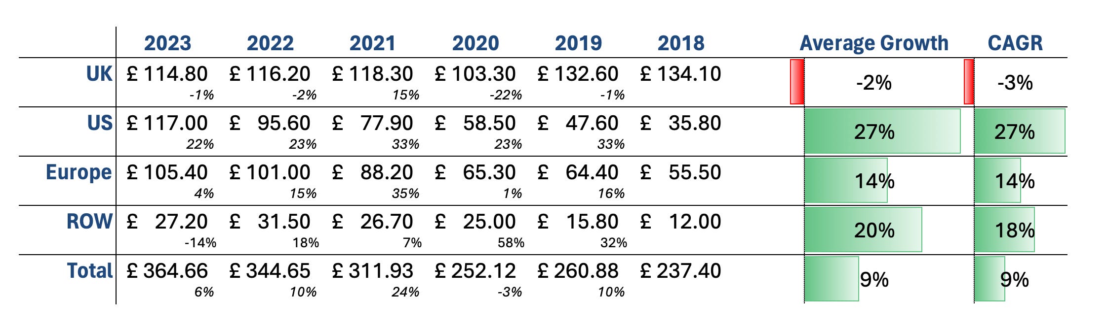 Looking at revenue growth since 2018, the most mature market of the UK has languished but the remaining markets of the US, Europe and Rest of the World have held strong resulting in a respectable 9% overall annual growth rate since 2018: