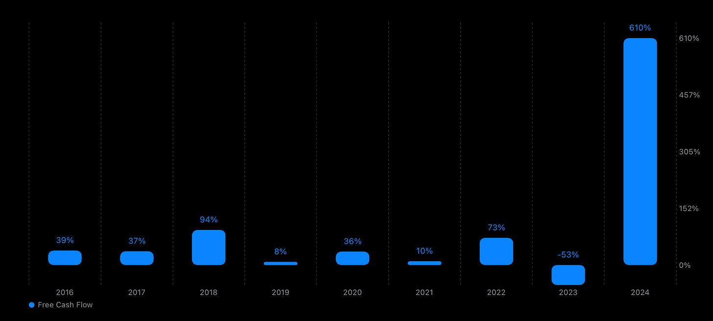 Looking at the past 10 years, Nvidia has had an impressive track record, growing at a 55.6% CAGR since 2015, and an average of 30% (25% CAGR) between 2015-2022 if we exclude the 2023 bumper year.