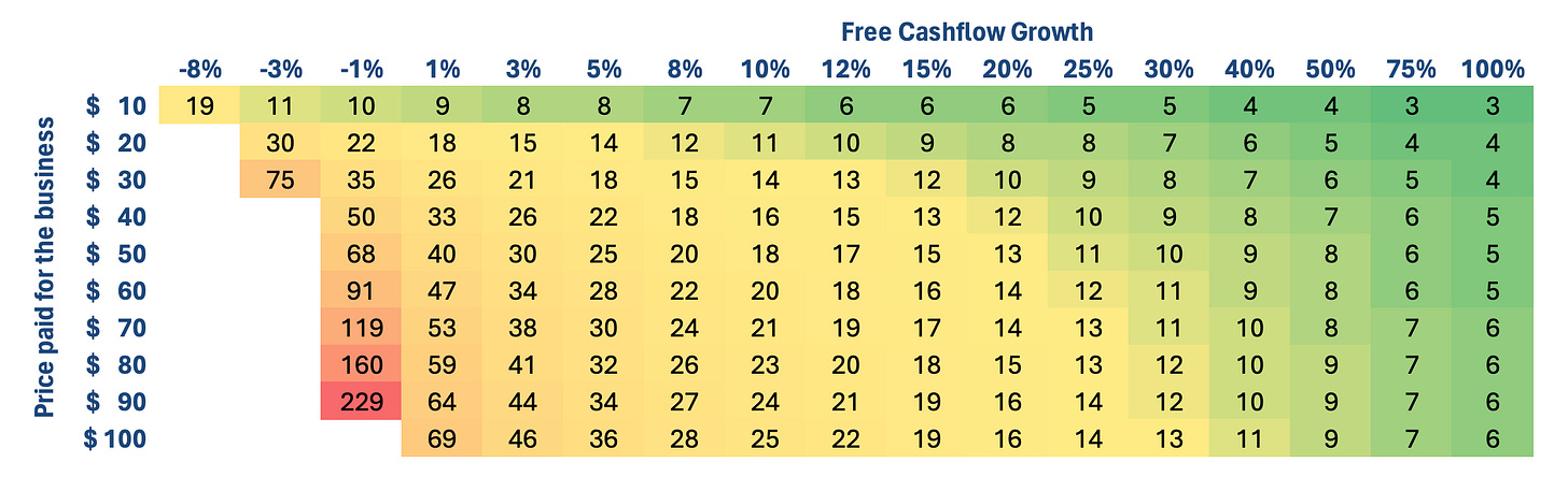 We can see that the price we pay for a business has a built in growth requirement if we expect to get our money back in a reasonable time period. We can ask the question “What growth rates are necessary just to recover my investment”. Here we have calculated the number of years required to recover the price paid for the business for different valuations ($10 = 10x free cash flow, $80 = 80x free cash flow etc.). Then along the top we track the free cash flow growth rate and the table provides the number of years we need to wait to get our money back.