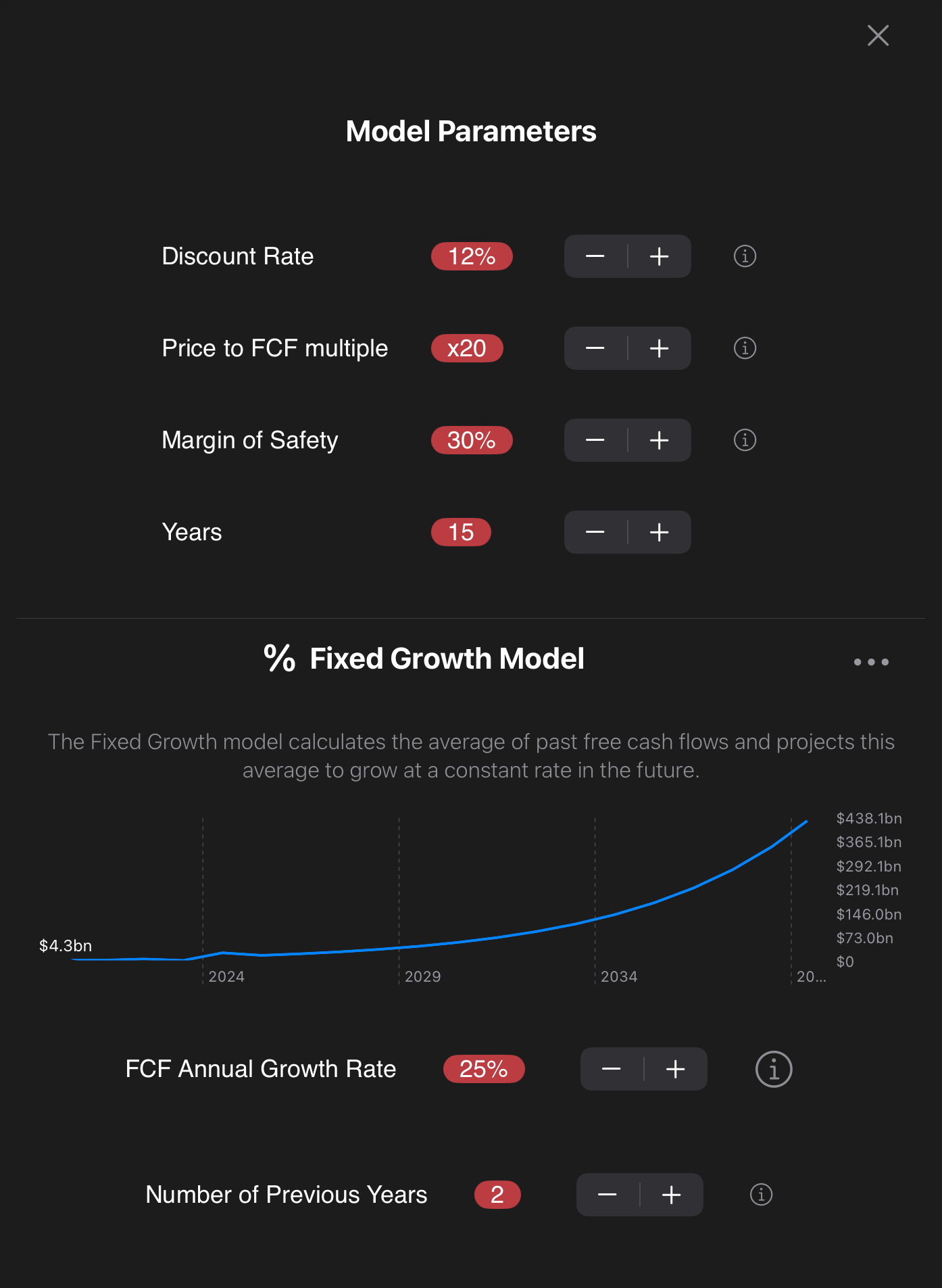 By tweaking the model parameters we can determine what is the implicit growth required to justify the fair valuation of the current market capitalization of the business.